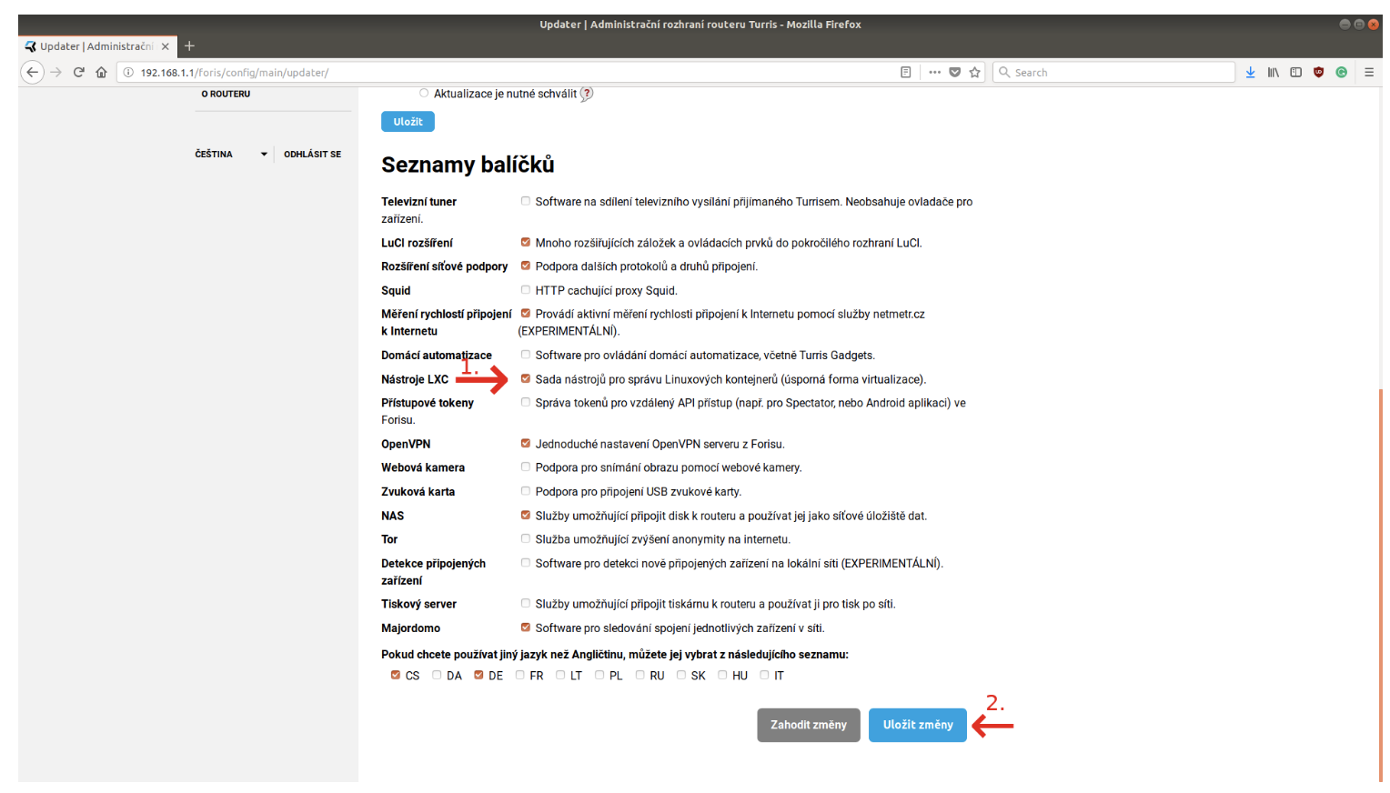 V rozhraní Foris přejděte do záložky Updater, zaškrtnete volbu Nástroje LXC a klikněte na tlačítko Uložit změny
