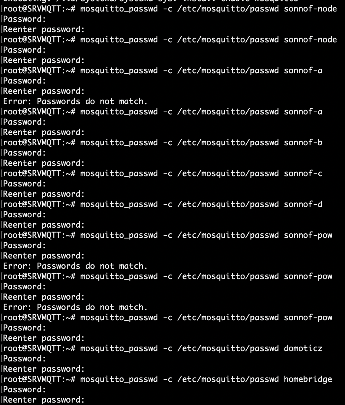 Mělo by být tvořeno tak, aby měl každý klient svůj vlastní účet. Klient je například zásuvka sonnof, domoticz server, nebo homebridge server. Pro každého uživatele opakujeme následující příkaz.