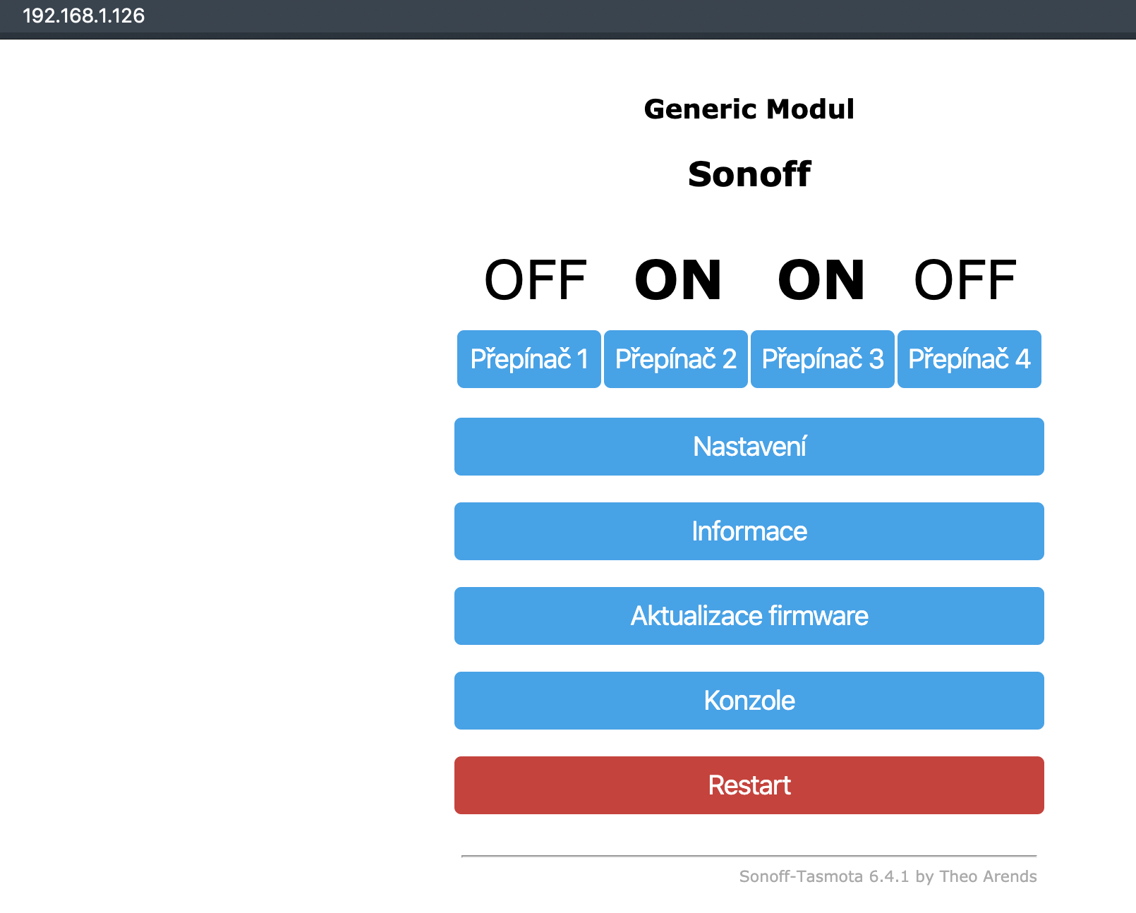 Základ je mít v modulu sonnof flashnutý firmware Tasmota. Předpoklad je že již máme modul připojen k wifi a dostanem se do konfigurace.