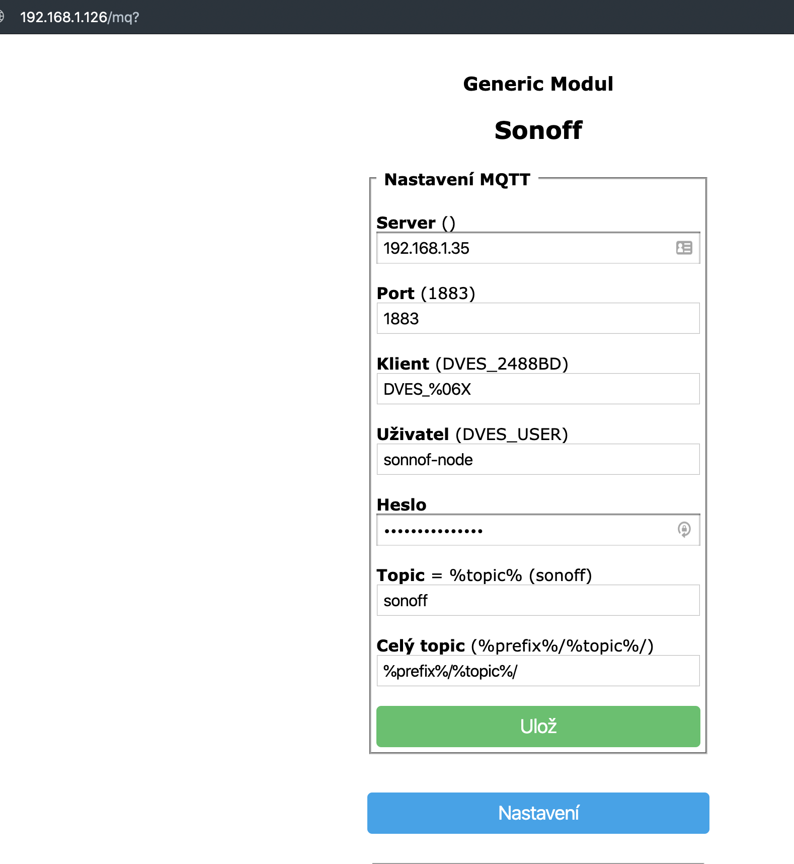Přejdeme na Nastavení -> Nastavení MQTT a vyplníme dle obrázku. Username a heslo máme vytvořeno z kroku 6 tohoto návodu
