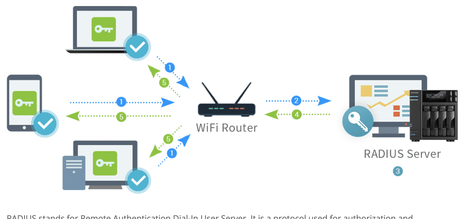 RADIUS stands for Remote Authentication Dial-In User Server. It is a protocol used for authorization and authentication. If you have a RADIUS server, you will have full control over who can connect your network and whom not to grant the access. This is applicable for all network types starting from wireless, VPN to direct and dial-up. Therefore, it is the middle layer in between the communication of the clients and servers.