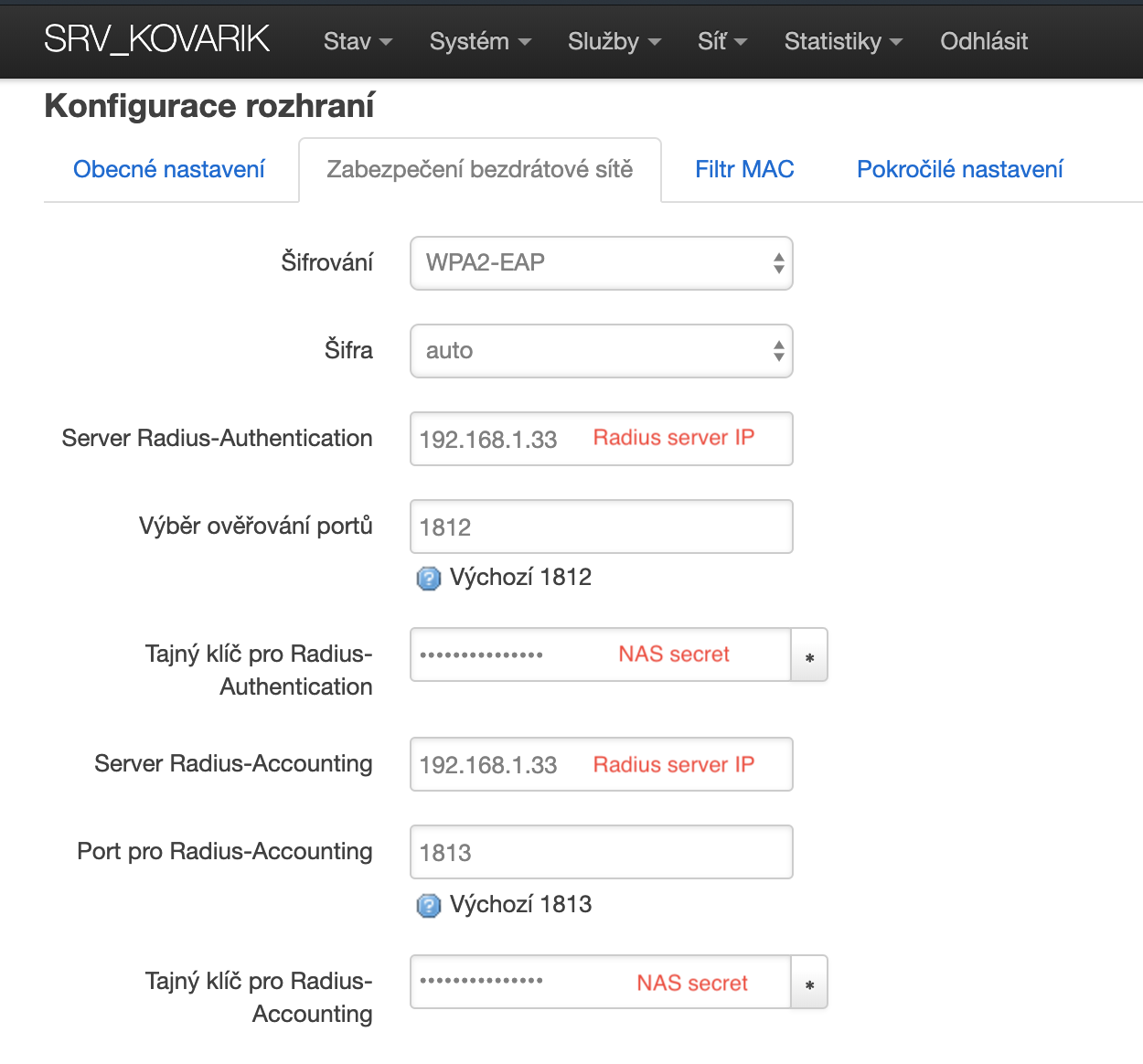 dle tohoto návodu: https://intranet.rs-kovarik.cz/srvtemplate Místo SRV_TEMPLATE zadat jméno SRV_RADIUS